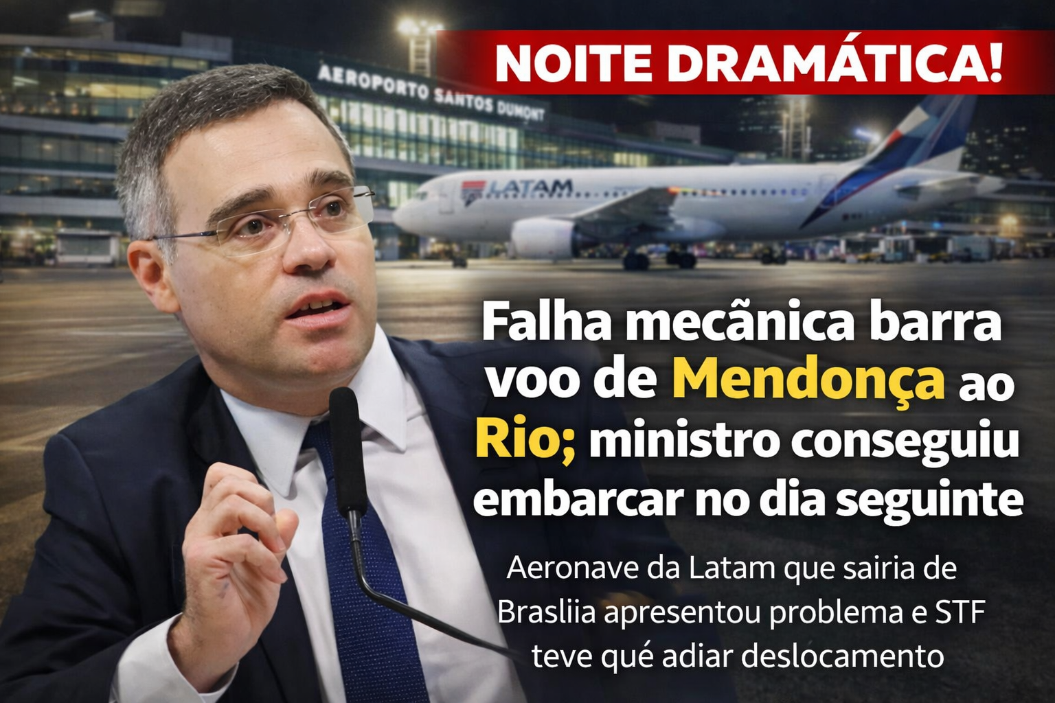 Um voo que levaria o ministro do Supremo Tribunal Federal (STF) André Mendonça, de Brasília ao Rio de Janeiro, precisou ser cancelado na noite de quinta-feira (19) após a identificação de uma falha mecânica na aeronave. O problema impediu a decolagem do avião, que pertence à companhia aérea Latam, e obrigou o magistrado a adiar a viagem para a manhã desta sexta-feira (20).